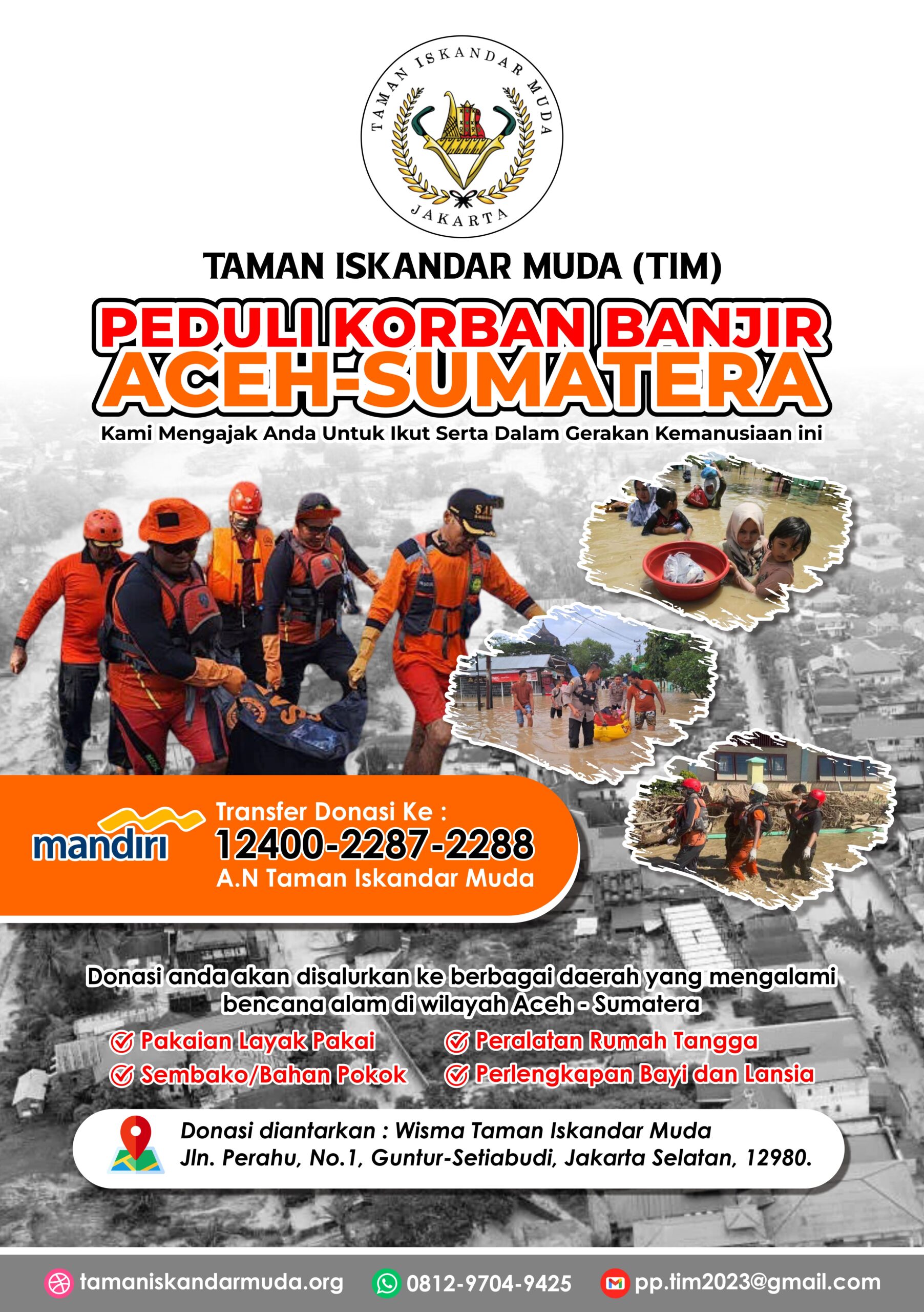 Pengurus Pusat Taman Iskandar Muda (PPTIM) bersama cabang, organisasi lokal (orlok), dan organisasi sektoral (orsek) di bawahnya menunjukkan kepedulian yang tinggi atas bencana banjir dan tanah longsor yang melanda Aceh pada akhir November 2025.